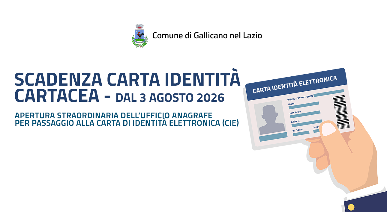Apertura straordinaria dell'Ufficio Anagrafe per il passaggio alla Carta d'IdentitĂ Elettronica (CIE) nei giorni di sabato 21 febbraio e 28 marzo.